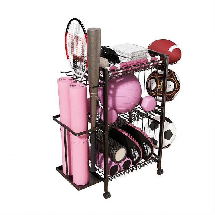 This floor standing metal yoga mat storage rack has three layers plus two side storage systems. The left side is independently designed, widening the space, which can hold 2-3 regular-sized yoga mats when placed upright. The upright storage can also accommodate long-type equipment such as tennis rackets, baseball bats, hockey sticks, etc.